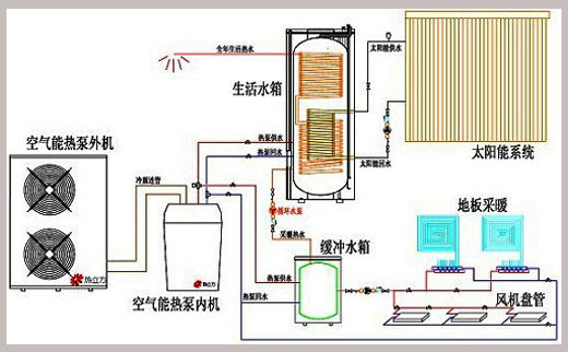 系統采用空氣能熱泵輔助太陽能,或電輔助太陽能,或單獨空氣能熱泵帶動,結合地暖、風機盤管(立式或者吊頂)實現冬季采暖;