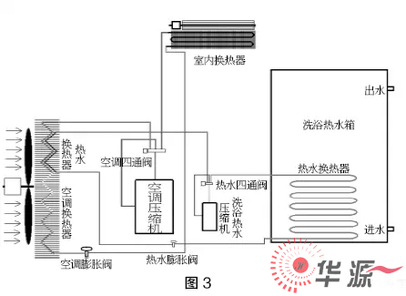熱泵三聯(lián)供系統(tǒng),概念新穎,所謂空調(diào)模式運(yùn)行時(shí)可以免費(fèi)加熱洗浴熱水,購(gòu)買一套三聯(lián)供設(shè)備,可以實(shí)現(xiàn)室內(nèi)制冷、供暖及洗浴熱水。可以降低部分初投資,但運(yùn)行費(fèi)用與空調(diào)加空氣源熱泵熱水機(jī)的運(yùn)行費(fèi)用是相同的。如下圖2所示: